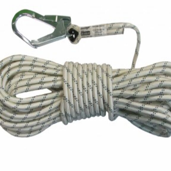 LÍNEA DE VIDA COMPUESTA DE CUERDA DE POLIÉSTER TRENZADA DE ALTA TENACIDAD DE 12MM O 16MM. COSIDA EN UN EXTREMO CON HILO DE POLIAMIDA DE AL-TA RESISTENCIA. INCLUYE MOS-QUETÓN DE ACERO DOBLE SEGU-RO ESTRUCTURERO CON GUAR-DACABO Y DESLIZADOR AUTOMÁ-TICO DESMONTABLE GALVANI-ZADO ANTICORROSIÓN CON SE-GURO PARA POSICIONAMIENTO.