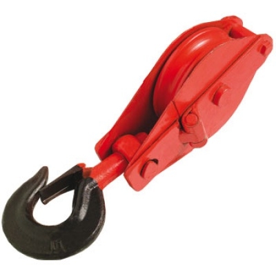 Roldana simple de 500 kg. Con placa lateral de fácil apertura. Gancho giratorio con traba de seguridad. Polea de 73 mm. Para soga de 16 mm.